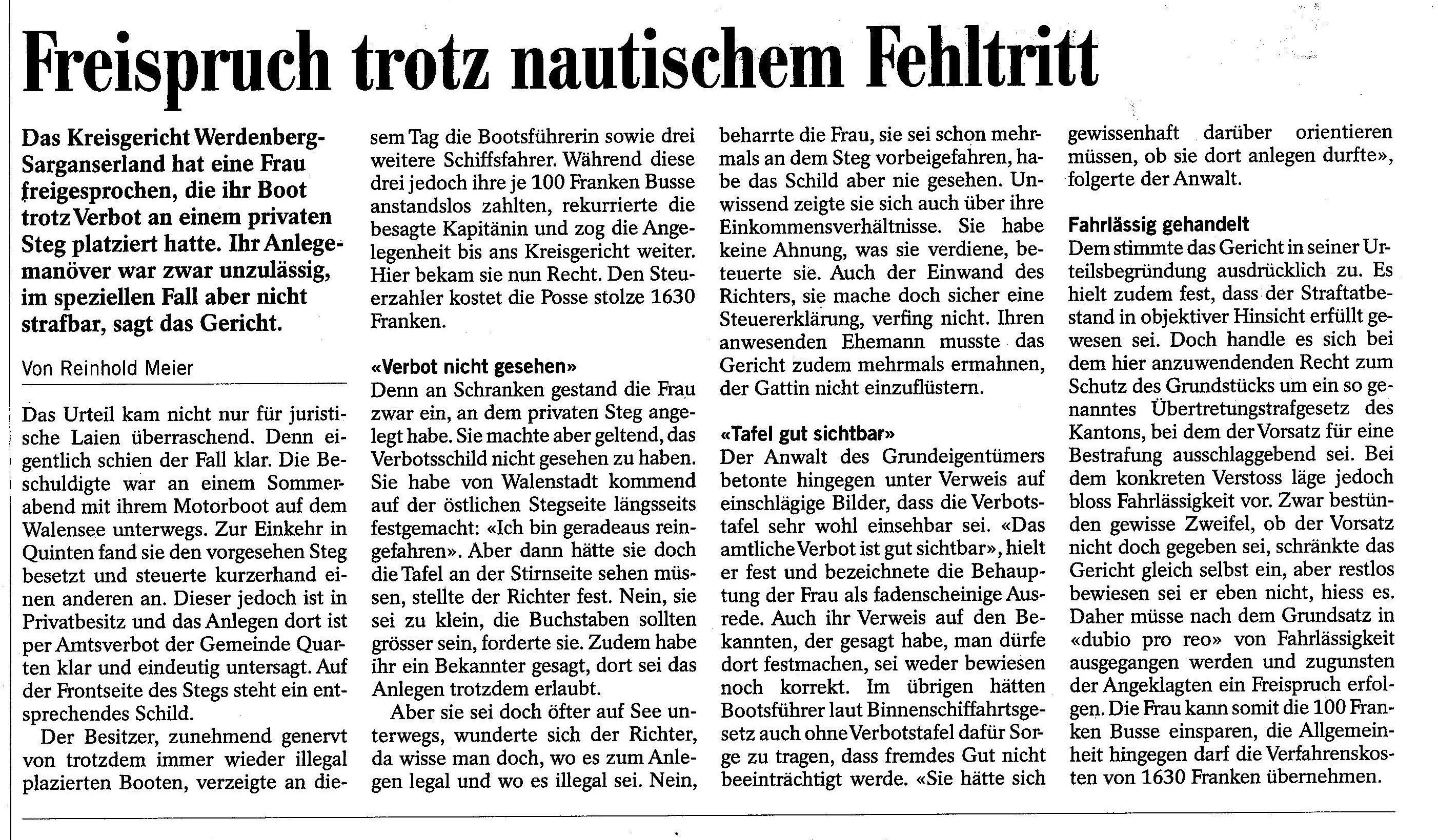 Eine Frau steuerte ihr Motorboot im Walensee Richtung Quinten und wollte dort in einem Gasthof einkehren. Der dafür vorgesehene Steg war aber schon besetzt. So steuerte sie einen anderen an. Dieser ist jedoch durch ein Amtsverbotsschild klar als Privatsteg gekennzeichnet. Das ignorierte diese Kapitänin. Der Besitzer dieses Steges verzeigte an diesem Tag vier Bootsbesitzer, wovon drei die auferlegte Busse von Fr. 100.-